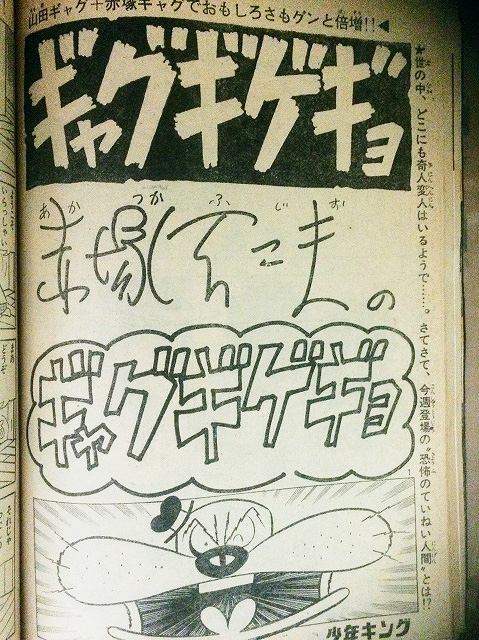 キングの中では人気のあったギャグマンガ「おそ松くん」を失った編集部は赤塚に新連載を依頼します。そして1974年に「山田一郎」とふざけたペンネームで始まったのが「ギャグギゲギョ」です。主人公のキャラクターがいない、毎回違うキャラクターによるギャグマンガは異色であり、野心作といえるかも知れません。