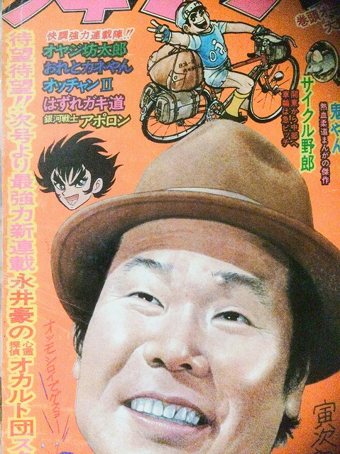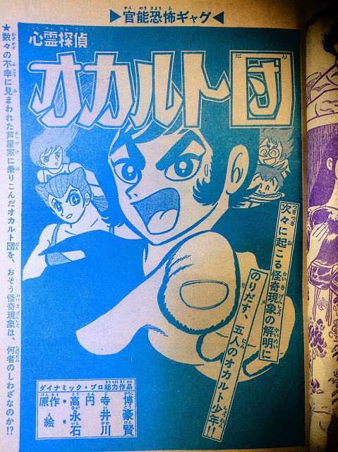 しつこいようですが、1975年にキングはヤングコミックの桑村誠二郎を編集長に起用して誌面大刷新を計るもののこれが失敗し、わずか半年もたたずに部数は半減します。窮地に陥ったキング編集部が救いを求めたのだが、増刊少年キングオリジナルの「リョコー少年団」(永井豪+石川賢)で人気を得ていた永井豪でした。そのころの永井は”ウルトラ・ビッグネーム”でなんとキングは連載が始まる前から表紙に「次号から豪ちゃんの連載がはじまるでガスよー!」と入れました。表紙に次号予告が入るなど少年誌では前代未聞、読者の私も「こりゃすごい!」と楽しみになりました。その永井の新連載が’75年の34号から始まった「心霊探偵オカルト団」(原作・高円寺博 絵 永井豪/石川賢)でした。原作つきというのは永井豪にしてはめずらしいな、とは思いましたが、天下の永井豪が我がキングに描いてくれるのです。