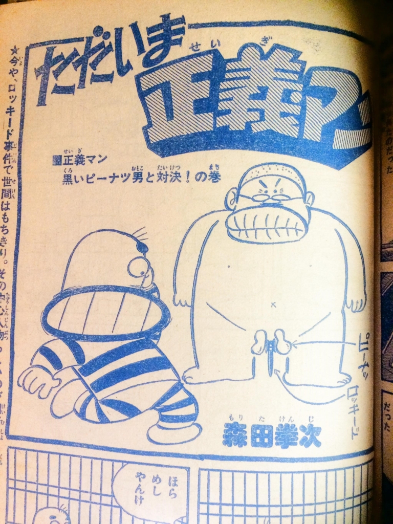 「モリケン」というと俳優で県知事の森田健作ではなく、マンガ家の森田拳次というのはマンガファン、少年キングファンの常識でしょう。私が1974年から少年キングを購読するようになり、すぐに森田拳次の「3の3の3」がスタートしました。森田は1961年(昭和36年)少年画報に「ポパイ」を発表して雑誌デビューし、またたく間に人気マンガ家となります。昭和30年代後半から40年代前半まで赤塚不二夫と人気を二分する売れっ子ギャグマンガ家でした。しかしギャグの本質を追求するうち、コママンガよりひとコママンガに可能性を見い出し、40年代半ばに10数本の連載マンガを終わらせて、ひとコママンガの本場アメリカに移住します。アメリカでの修行を終え帰国しますが、日本でのひとコママンガは新聞の風刺マンガくらいしか無く、森田は少年誌にギャグマンガを再び描き始めました。しかし少年誌でのブランクは大きく、時代は赤塚不二夫一色でした。森田は人気絶頂のころ、多忙をきわめて少年キングでの連載作品は少なく、帰国後にキングのレギュラーになります。きっかけはキング副編集長・馬島進に声をかけられて、1973年(昭和48年)1号から空手劇画「さむらいカポネ」の連載をスタートさせたことでした。同作を39号まで描いたのち、「本職」のギャグマンガ「流行性かん坊」を42号から始めます。そして’74年の9号から「3の3の3」を開始、私はこの作品で森田拳次と出会います。私はそれまで「森田拳次」といえば「丸出だめ夫」や「ロボタン」の作者、という程度の知識しかありませんでした。ですから「3の3の3」を読んで”モリケンギャグ”に親しみを感じるようになったというわけです。