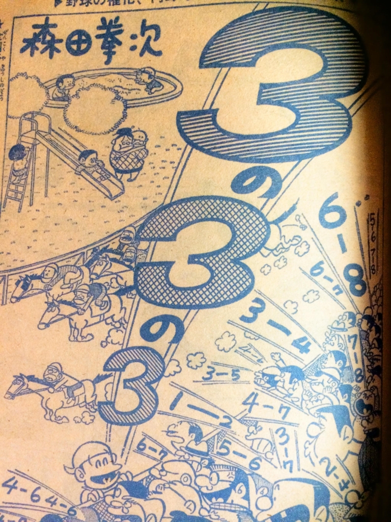 1973年から1975年までの3年間、森田拳次はキングのレギュラーマンガ家でした。そして「3の3の3」はモリケンギャグの真骨頂でした。森田はその後、念願のひとコママンガを大量に発表して、海外の有名な賞を取るなど活躍します。