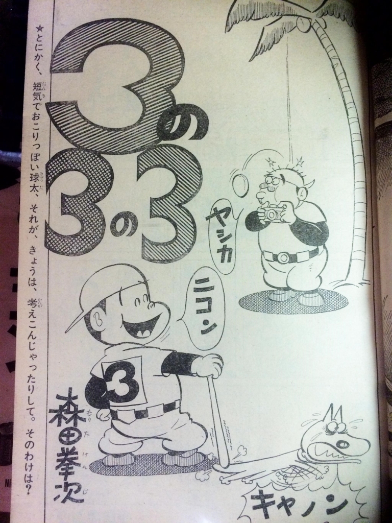 森田拳次のギャグマンガは決して新しいものではありません。むしろライバル赤塚不二夫と較べてスローテンポで突飛な絵・コマ割り・急な転回は少なく、のんびりした感じです。森田は大人気のころからトビラの絵をひとコママンガにしていて、「3の3の3」でもトビラを見るのが楽しみでした。ドタバタよりストーリー性のあるギャグマンガで、オチもきちんとあり、”ギャグマンガ”という言葉がまだ無いころの”ユーモアマンガ”の系統といえます。「3の3の3」でとくに面白かったのは、”セコい悪ふざけ”でマンガの中に実名の商品を出して勝手にPRして、次の号でその会社から商品がいくつ届いた、ありがとう、と報告するのです。作者がその商品をひとり占めしたのか、編集者に分けてあげたのかは知りませんが、自分の作品の中でこういうセコい儲け方をするのは私の知る限り森田だけで、もちろんそれは立派なギャグになっていました。赤塚不二夫が平気で手抜きマンガを描いても森田拳次はいつも”ちゃんとした”ギャグマンガを描いていました。「3の3の3」は翌’75年18号まで1年以上続き、日大健児の「ドッキリ仮面」とともにキングのギャグマンガをけん引きしていました。
