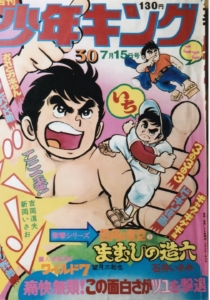 少年キングへの初登場は72年の14号、「ごぞんじ『青空商売大繁盛』でした。そして17号に「甲子園汗と涙③『片腕の力投』」、30号から34号に短期連載「大ばか小ばか親子バカ」といずれもオリジナル作品を発表しています。