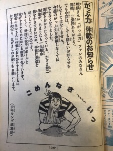 ラストページの柱(原稿の欄外)に小さく、「今週の「がっぷ力」はかざま先生急病の